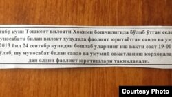 Тошкент вилояти ҳокимлигининг ўзини таништирмаган мулозими Озодлик билан суҳбатда ҳоким томонидан шундай буйруқ берилганини тасдиқлади: