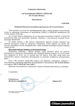 Озодлик 16 июль куни боғланган UZAUTO MOTORS автомобилларини сотувчи икки дилерлик салони ходимлари¸ 2020 йилги Cobalt ва Nexia R3 машиналари эгаларига биттама-битта қўнғироқ қилиниб¸ уларнинг бепул техник сервисга чақиртирилаëтганини тасдиқлади.