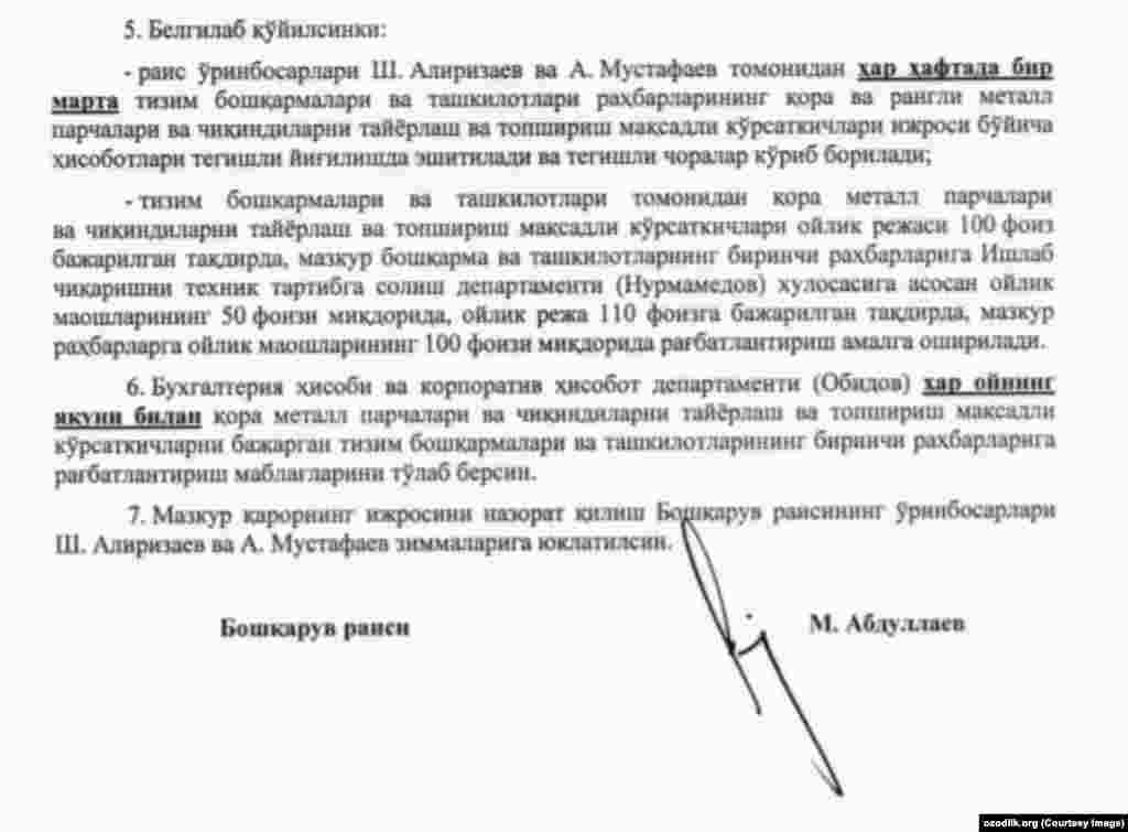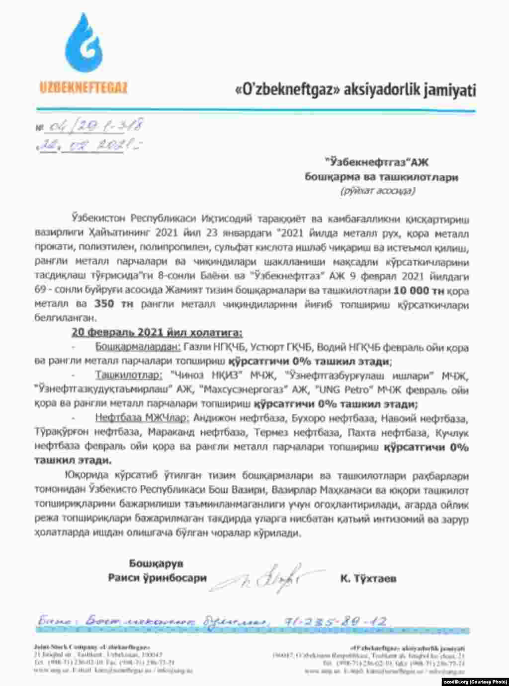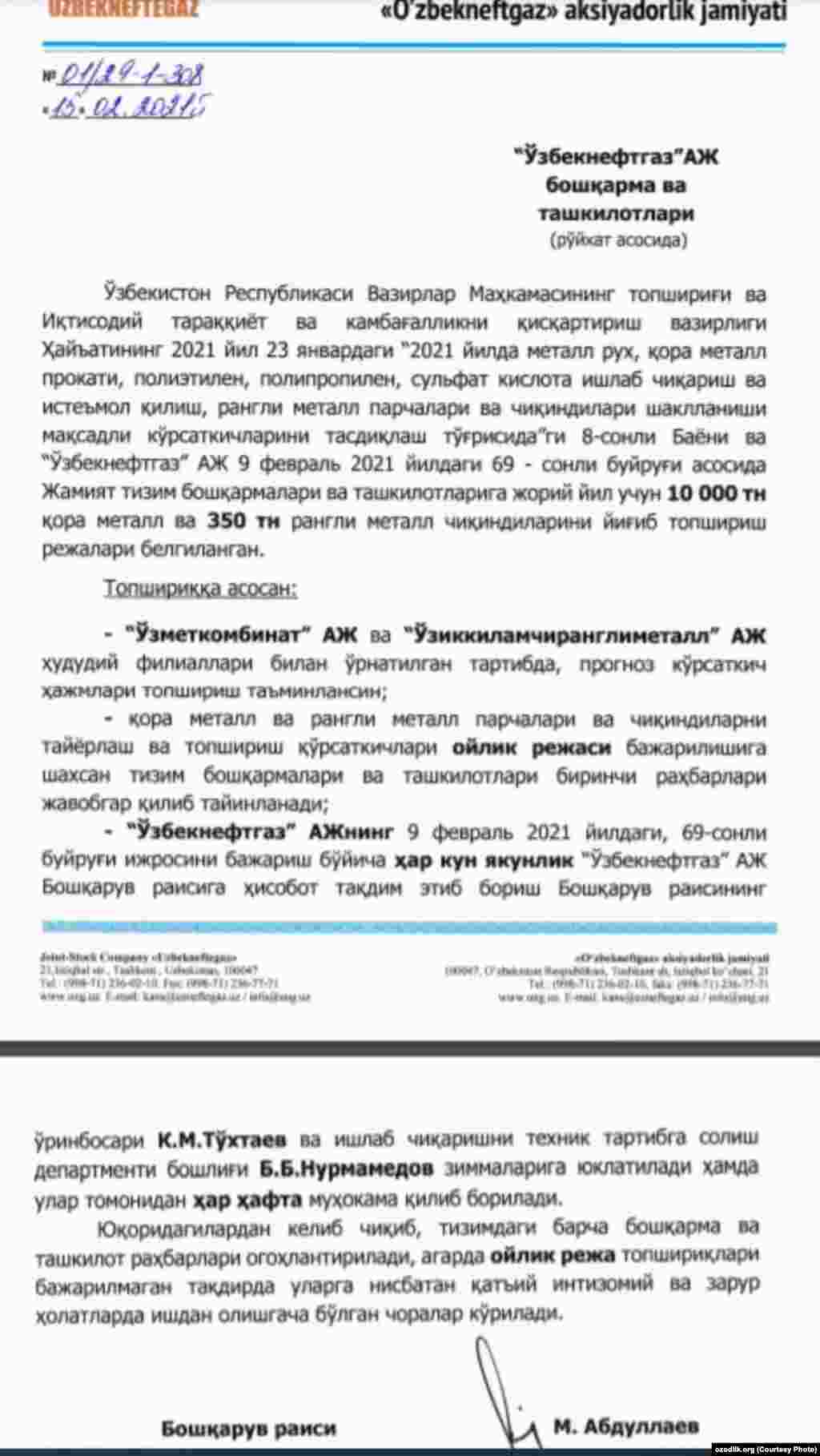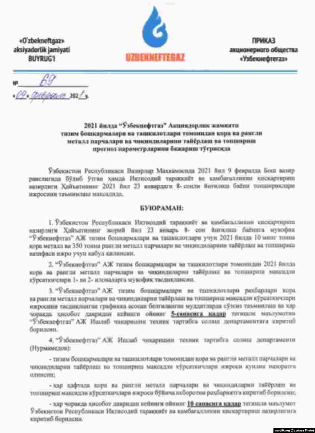 “Ўзбекнефтгаз” АЖ кейинги 1 ой ичида металл йиғишга оид 4 та буйруқ чиқарган бўлиб, Озодлик ушбу ҳужжатлар нусхасини қўлга киритди.