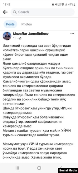 6 декабрь куни Фейсбукдаги саҳифасида эълон қилган постида Жамолитдинов тармоқларда газ ва электр муаммосидан шикоят қилаётган шахслар қамалмагани сабаб нолиётганини таъкидлади: