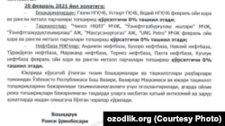 “Ўзбекнефтгаз” АЖнинг Озодлик боғланган мулозими “металлолом солиғи” Иқтисодий тараққиёт ва камбағалликни қисқартириш вазирлиги буйруғи билан амалга оширилаётганини таъкидлади.