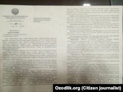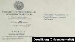 Бош прокуратуранинг Олий хўжалик суди (ҳозирда Олий суд) раёсатига протести 2017 йилнинг 20 апрелида имзолангани Озодликка бугун маълум бўлди.