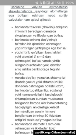 Ўзбекистонда қора бозорда валюта айирбошлашга қарши кураш кетмоқда. Мен ўқитувчиман, қонунга риоя қилишда бошқаларга ибрат бўлишим керак¸ дея банкка боргандим. Афсус, банклар асоссиз равишда сарсон қилиб, қора бозорнинг яна гуллашига сабаб бўлмоқда”.