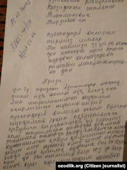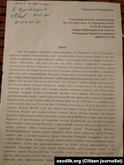 Термиз шаҳри ҳокими, вилоят ҳокими, вилоят хотин-қизлар идораси раҳбари қабулига ойлаб қатнадим. Вазирлар Маҳкамаси, Бош прокуратурага шикоят ёздим. Аввалдан қилган тўловим асосида Термиз тумани Аму мавзесидаги арзон уй-жойлардан ажратиб беришларини сўрайман”.