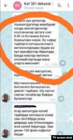 Телеграм гуруҳларидан бирида бу борада фикр билдирган ёшлардан бири деканат томонидан юборилган хабар скриншотини эълон қилди.