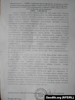 Шикоят қилишича, Ражабой Холназаровага ваъда қилинган уй берилмаган, дастлабки тўлов учун берган 12 ярим миллион сўм пули эса 1 ярим йилча банкда қолиб кетган.