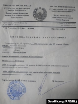 Термиз шаҳри ҳокимиятидан олинган маълумотга кўра, раҳбарият Ражабой Холназарованинг аҳволидан хабардор, унинг шикояти ҳокимликнинг уй-жой билан таъминлашга масъул бўлимида қабул қилинган.